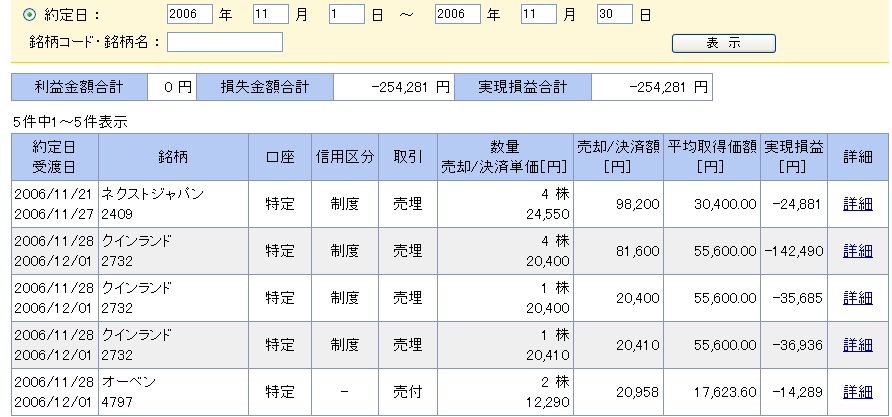 Bloombergの記事で「個人投資家は壊滅状態か」という記事がありましたが、まさにそのとおり!(--; 11月の実現利益= -254,281円 人真似シストレのトータル損益は 239,890円(3ヶ月間) 今週の顛末は下記のとおりでした。 11月28日(火) 携帯に証券会社から約定通知のメールが届く 「えっ、何も注文してないのに…」 しかも20株保有しているオーベン(4797)から2株だけ売却している 「なんだ!いたずらか!?」 と思ったら、信用取引の保証金不足で強制決済されてました。。。 このままだと危ないということで、売り予定の日付が迫っている クインランド(2732)を6株売却 これで -215,111円の損失が確定してしまいました。 最近は利益確定もできずに、新規買い建てできずにいるので 面白い更新ができなくてすみません~ 10月に勘で買った銘柄がやはり足を引っ張りまくってるんですね 早くこれらを処分できればいいな。 ということで、来週の結果にも乞うご期待!
